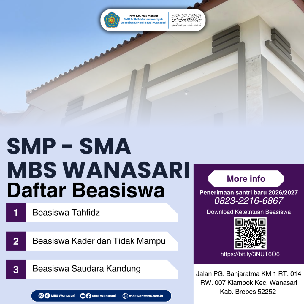 "Ayo wujudkan impian menuntut ilmu di MBS WANASARI!'' Daftarkan dirimu sekarang lewat jalur beasiswa dan raih kesempatan belajar agama dan ilmu umum secara gratis. Tempat terbatas, jangan sampai terlewat!