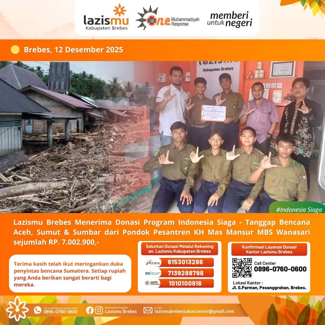Brebes — Ikatan Pelajar Muhammadiyah (IPM) Muhammadiyah Boarding School (MBS) Wanasari menyalurkan donasi hasil penggalangan dana kepada Lazismu Pimpinan Daerah Muhammadiyah (PDM) Kabupaten Brebes pada Jumat, 13 Desember 2025. Penyerahan donasi dilakukan langsung di Kantor Lazismu Brebes sebagai bentuk nyata kepedulian pelajar dan keluarga besar MBS Wanasari terhadap saudara-saudara yang terdampak bencana alam. Penyerahan donasi tersebut diwakili oleh beberapa santri Pesantren Muhammadiyah KH. Mas Mansur yang mewakili IPM MBS Wanasari. Mereka menyerahkan hasil penggalangan dana yang dihimpun selama satu pekan penuh dengan penuh rasa syukur, bahagia, dan semangat. Para santri mengaku merasa senang karena dapat terlibat langsung dalam aksi kemanusiaan dan menyalurkan amanah para donatur melalui lembaga resmi Muhammadiyah. Total donasi yang berhasil dihimpun mencapai Rp7.496.900. Dari jumlah tersebut, sebesar Rp7.042.900 berasal dari donasi para santri, wali santri, ustaz dan ustazah, bapak dan ibu guru, karyawan MBS Wanasari, serta masyarakat sekitar lingkungan pesantren. Sementara itu, sebesar Rp454.000 merupakan hasil infak jamaah Salat Jumat Masjid Al Muthalib MBS Wanasari. Capaian ini menjadi bukti kuatnya semangat gotong royong dan kepedulian sosial di lingkungan pendidikan Muhammadiyah. Dana donasi diterima oleh Pandu Nur Husna selaku staf Lazismu Brebes. Dalam kesempatan tersebut, ia menyampaikan apresiasi dan ucapan terima kasih yang sebesar-besarnya kepada IPM MBS Wanasari dan seluruh pihak yang telah berkontribusi. Menurutnya, bantuan tersebut sangat berarti untuk meringankan beban para korban bencana. Ia juga mengapresiasi peran aktif pelajar dalam gerakan filantropi dan kemanusiaan yang sejalan dengan nilai-nilai Muhammadiyah. Direktur MBS Wanasari dalam pernyataannya menyampaikan bahwa penggalangan donasi secara resmi telah ditutup dan seluruh dana yang terkumpul telah disalurkan melalui Lazismu Brebes sebagai satu pintu penyaluran. Hal ini dilakukan untuk memastikan transparansi, akuntabilitas, serta ketepatan sasaran dalam pendistribusian bantuan kepada para penerima manfaat. Lebih lanjut, Direktur MBS Wanasari juga menyampaikan bahwa bagi masyarakat yang masih ingin berdonasi, dapat menghubungi WA Center layanan jemput donasi di nomor 0896-0760-0600. Ia berharap semangat berbagi dan kepedulian sosial ini dapat terus tumbuh dan menjadi budaya di tengah masyarakat, khususnya di kalangan pelajar. Dalam penutupnya, Direktur MBS Wanasari mengucapkan terima kasih yang tulus kepada seluruh donatur atas keikhlasan dan kepercayaannya. Ia mendoakan semoga Allah Swt. membalas setiap kebaikan dengan balasan yang lebih baik, melimpahkan keberkahan harta, menjaga anak-anak dan keluarga para donatur, serta menjadikan amal tersebut sebagai pemberat kebaikan di akhirat kelak. Aksi ini diharapkan menjadi inspirasi bagi generasi muda untuk terus peduli, berbagi, dan hadir untuk kemanusiaan.